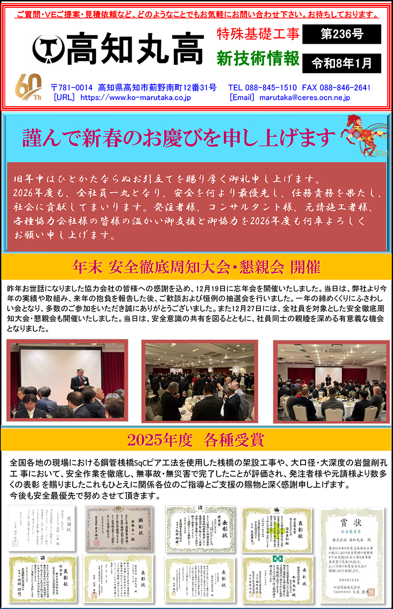 謹んで新春のお慶びを申し上げます。 旧年中はひとかたならぬお引立てを賜り厚く御礼申し上げます。 2026年度も、全社員一丸となり、安全を何より最優先し、任務責務を果 たし、社会に貢献してまいります。発注者様、コンサルタント様、元請 施工者様、各種協力会社様の皆様の温かい御支援と御協力を2026年度も 何卒よろしくお願い申し上げます。 第236号の記事はこちら