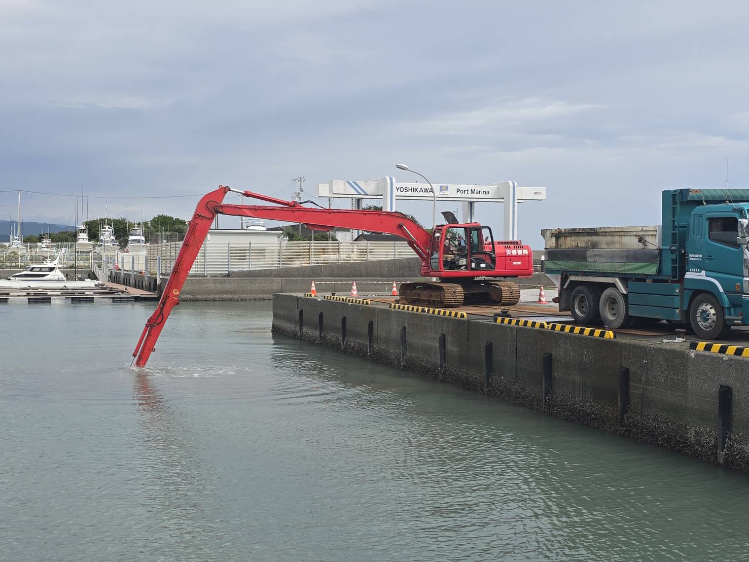 高知県内漁港に於きまして、ロングアームバックホーを採用頂き、順調に湾内浚渫が進んでいます。 ご安全に‼