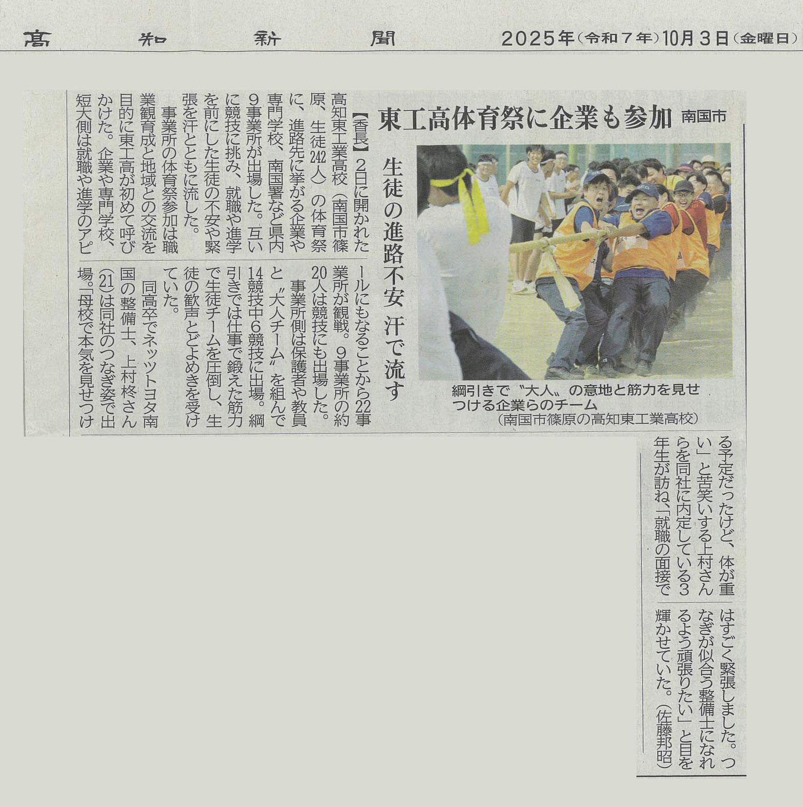 高知東工業高校(南国市篠原、生徒242人)の体育祭に、進路先として挙がる企業や専門学校、南国署など県内9事業所が参加。 事業所の体育祭参加は、職業観育成と地域との交流を目的とされておりました。その内の一社として、弊社も参加いたしました。10月3日の高知新聞に掲載されました。ぜひご覧ください。