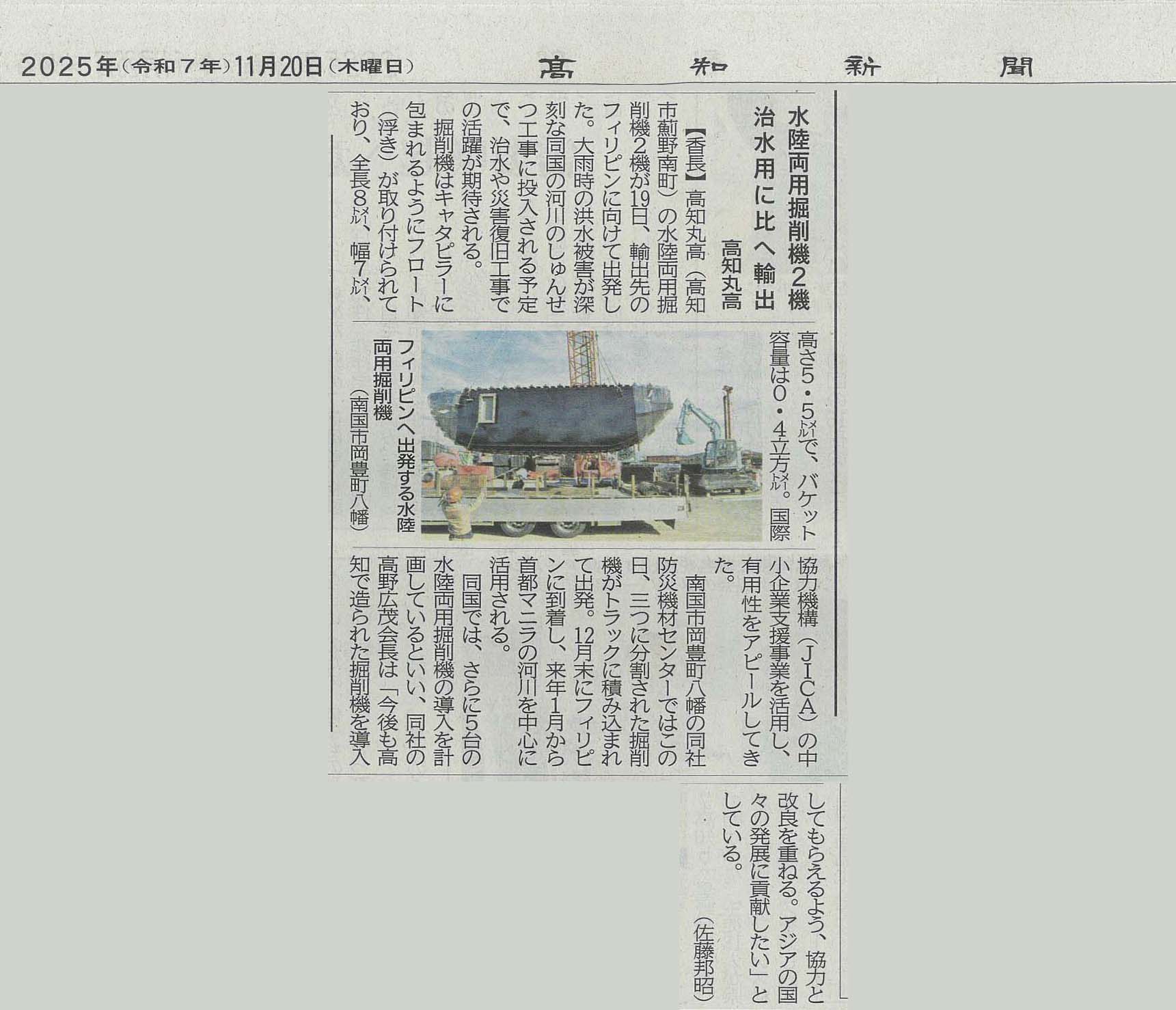 11月19日、弊社が開発した水陸両用掘削機2機をフィリピンへ輸出いたしました。本案件は、近年深刻化している洪水や河川氾濫への対策を目的として、 JICA(国際協力機構)の支援のもと実施 されるものです。導入後は河川の浚渫工事や災害復旧作業に活用され、地域の防災力向上に貢献することが期待されています。それについては、11月20日付の 高知新聞 に掲載されました。ぜひご覧ください。