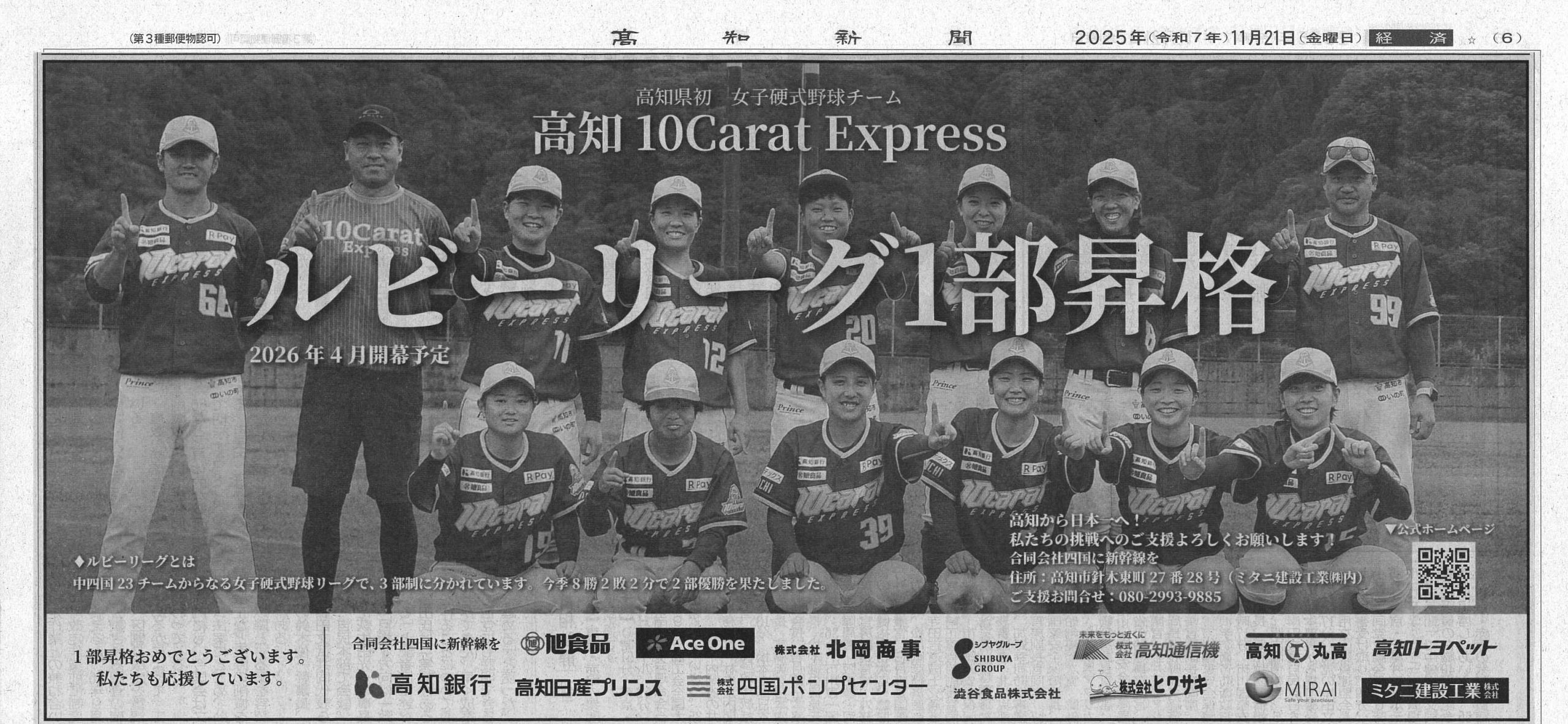11月21日付の高知新聞に、「高知10Carat Express」がルビーリーグ1部に昇格した記事が掲載されました。ぜひご覧ください。