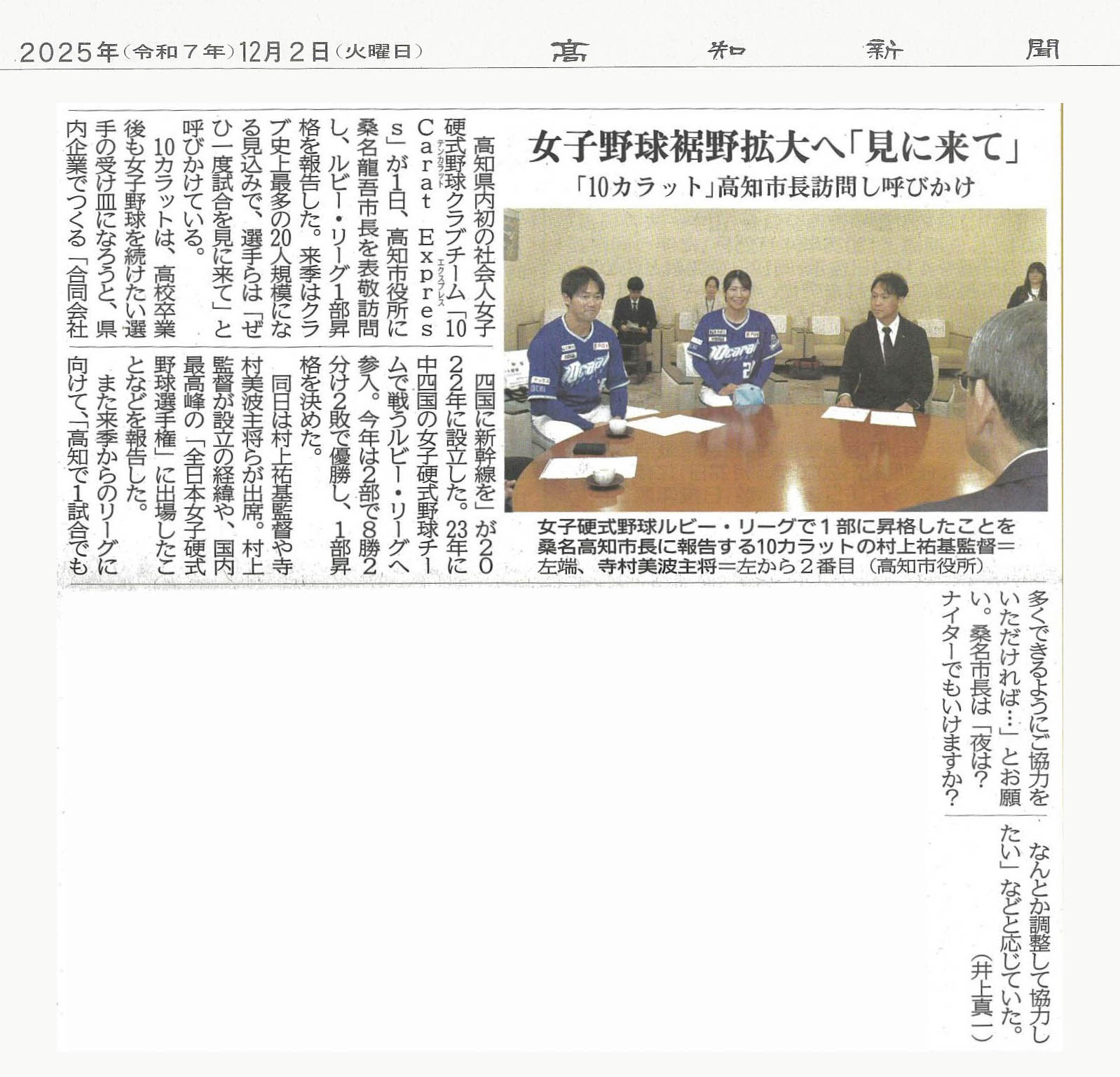 高知県初の社会人女子硬式野球チーム「100 Carat Express」が高知市役所を訪れ、ルビー・リーグ1部昇格を桑名市長に報告致しました。来季はチーム人数が約20人と過去最多となる見込みで、選手たちは「ぜひ試合を見に来てほしい」と呼びかけています。この内容は12月2日の高知新聞に掲載されました。ぜひご覧ください。