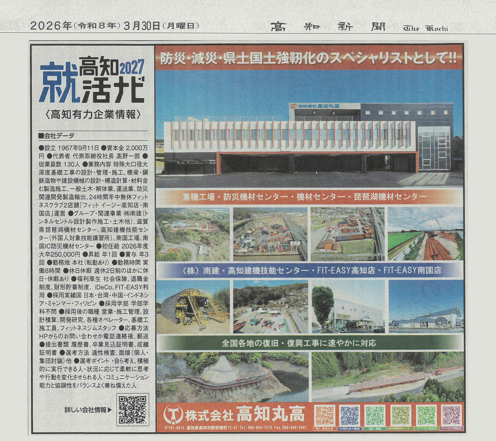 3月30日付の高知新聞におきまして、弊社の「高知2027就活ナビ」広告が掲載されました。ぜひ、ご覧ください。