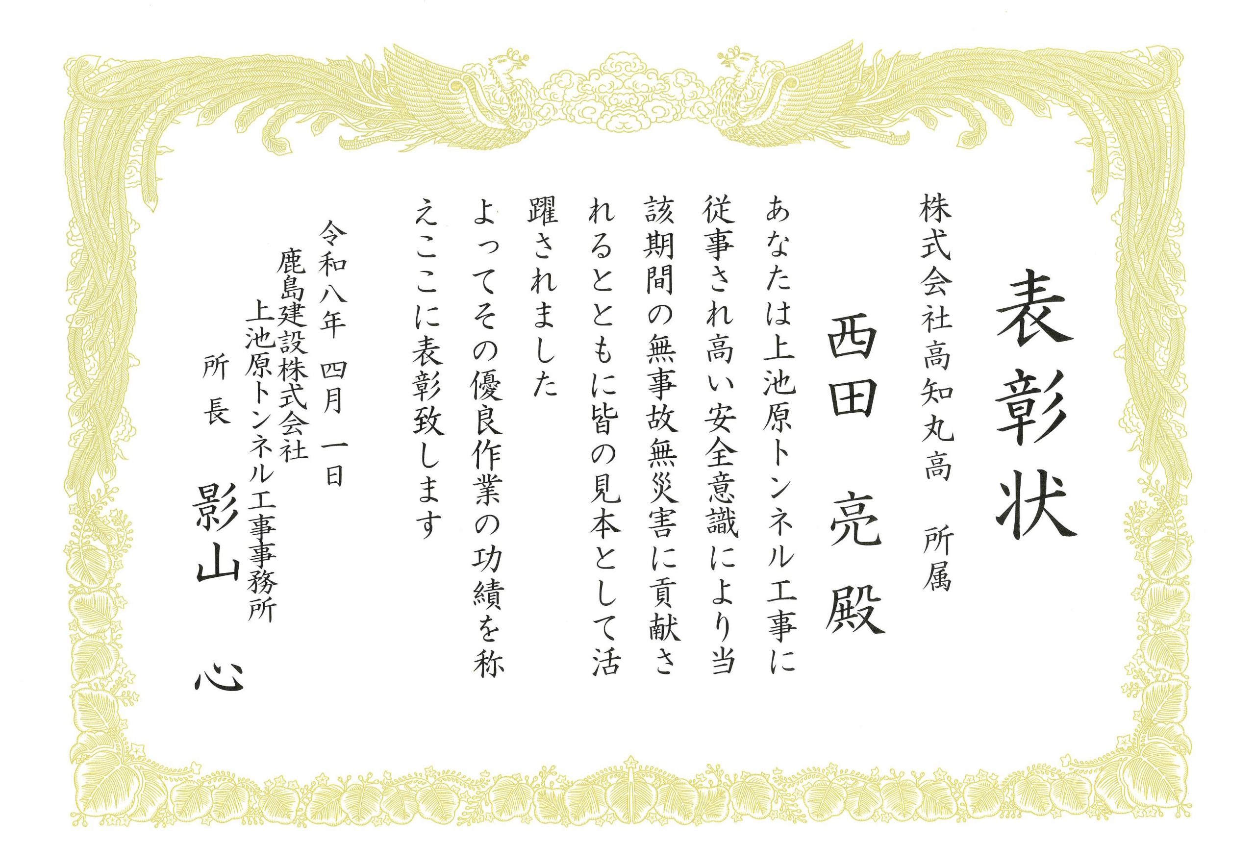 施工工事部 施工工事課 課長 西田 亮氏は上池原トンネル工事現場に従事し、高い安全意識のもと当該期間の無事故・無災害に貢献されました。その功績が認められ、鹿島建設株式会社 上池原トンネル工事事務所様より表彰を頂きました。