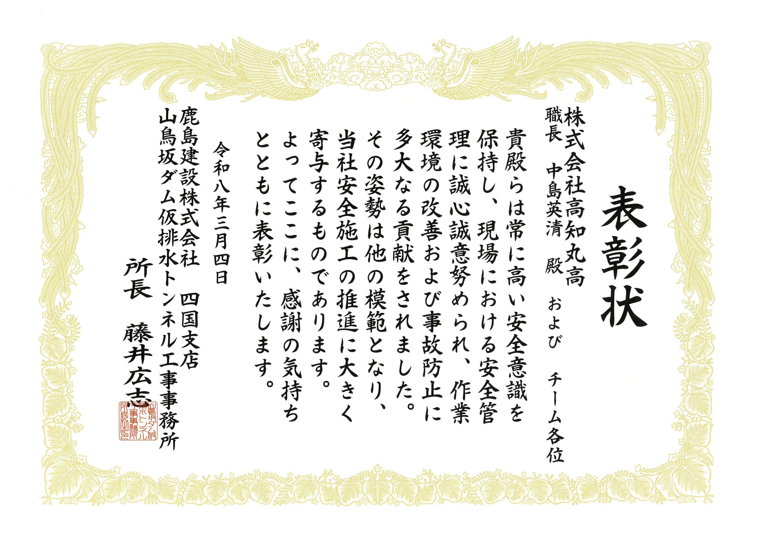 弊社施工工事部 部長 中島英清氏およびチーム各位は、山鳥坂ダム仮排水トンネル工事現場において安全管理に誠心誠意取り組み、作業環境の改善および事故防止に多大な貢献をされた功績により、鹿島建設株式会社四国支店様より表彰をいただきました。