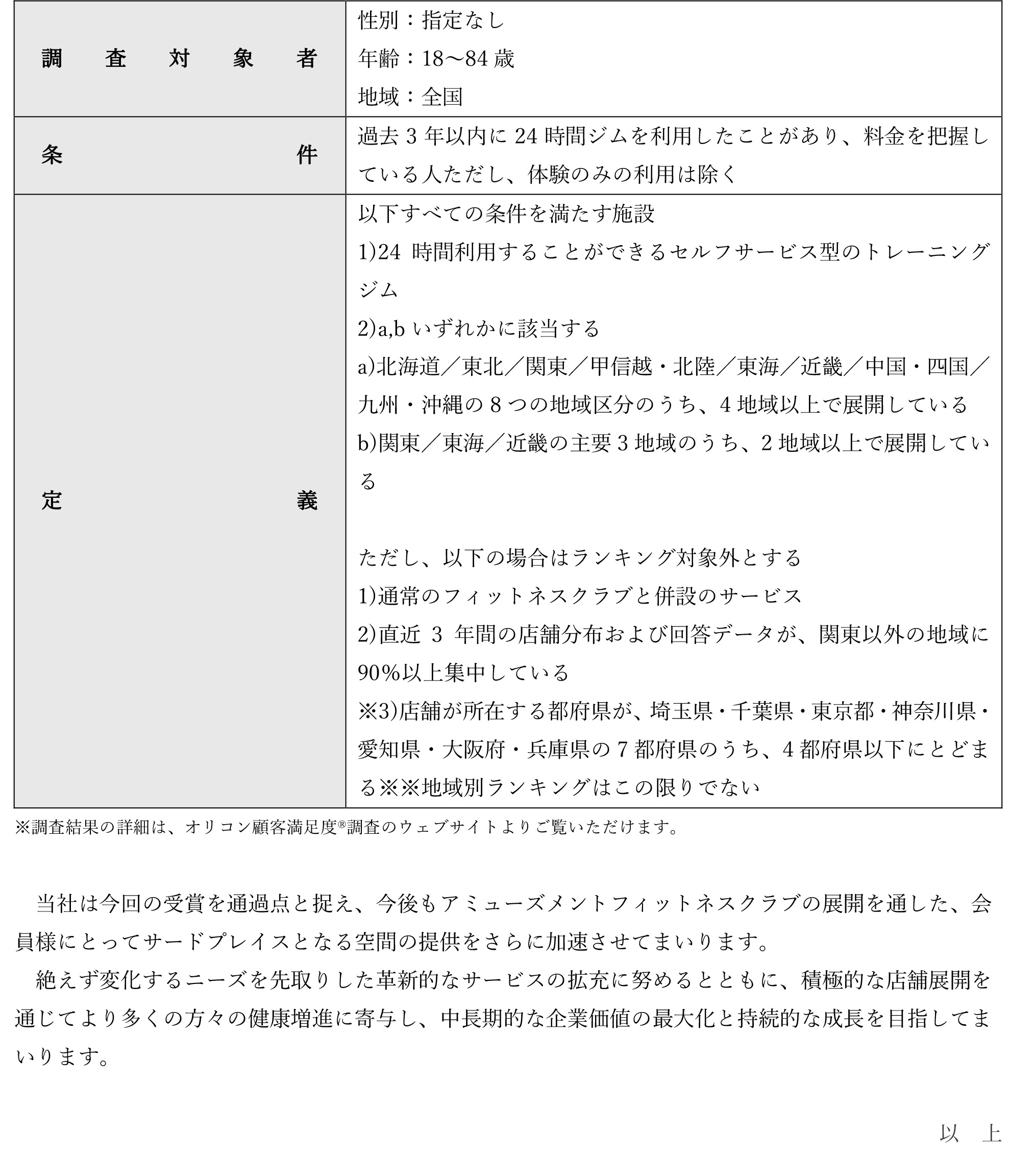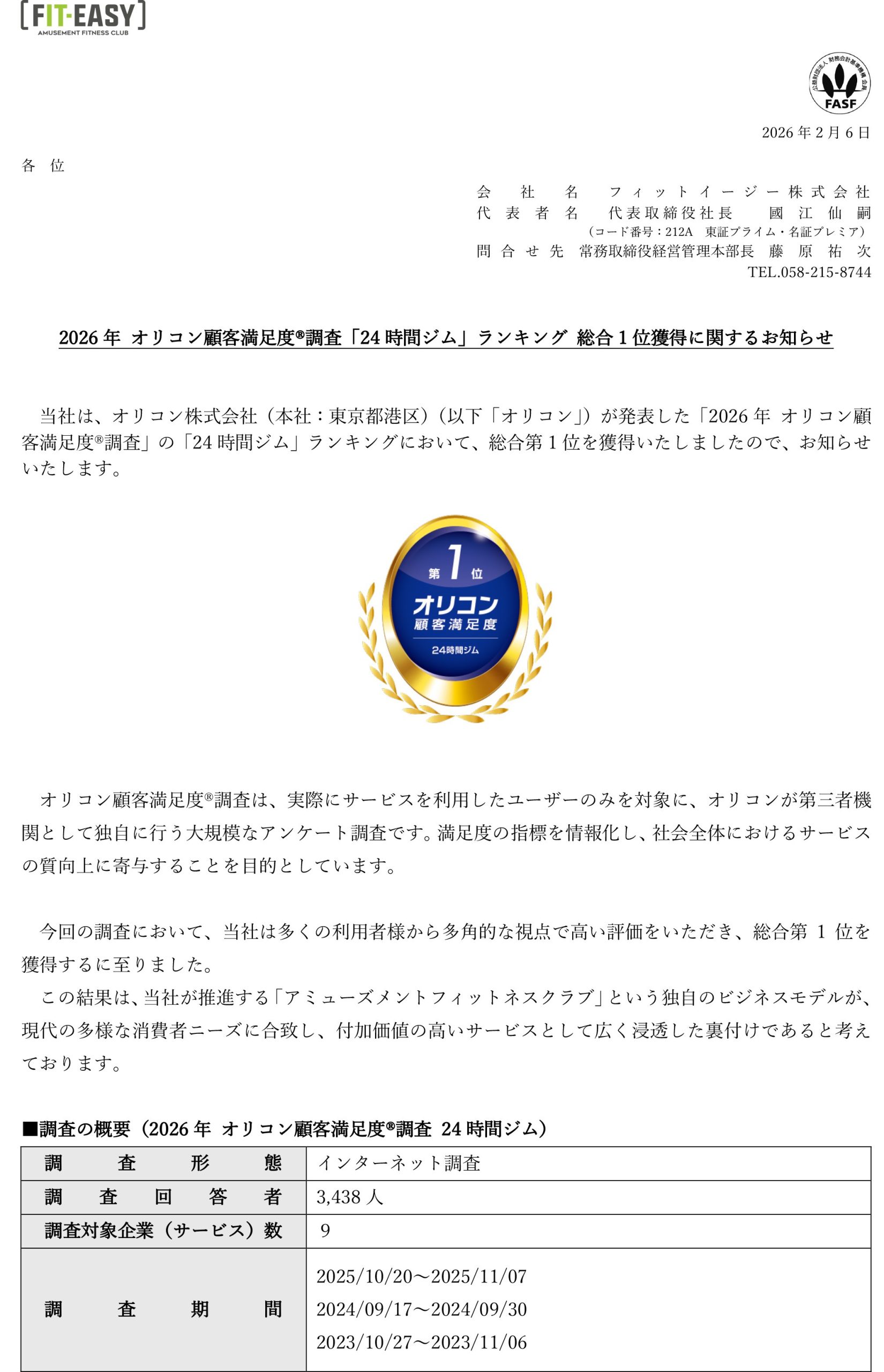 「2026年 オリコン顧客満足度®調査」の「24時間ジム」ランキングにおいて、アミューズメントフィットネスクラブ『フィットイージー』が総合第1位を獲得いたしました。ぜひ、下記の調査結果およびリンクをご覧ください。 2026年 オリオン 顧客満⾜度®調査「24時間ジム」ランキング 総合1位獲得